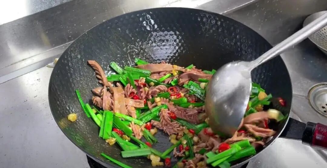9、炒至30秒左右,再下入切好的韭菜,继续的开大火给它爆炒一分钟左右,就可以出锅装盘。