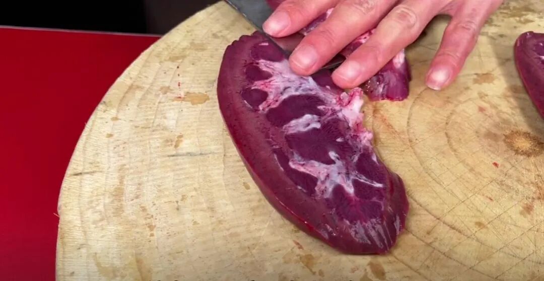1、猪腰买回来后,第一步就是给它撕去表面的筋膜,再用刀将猪腰一分为二,再给它去除腰骚,这个腰骚一定要去除干净,这样吃起来才没有异味。