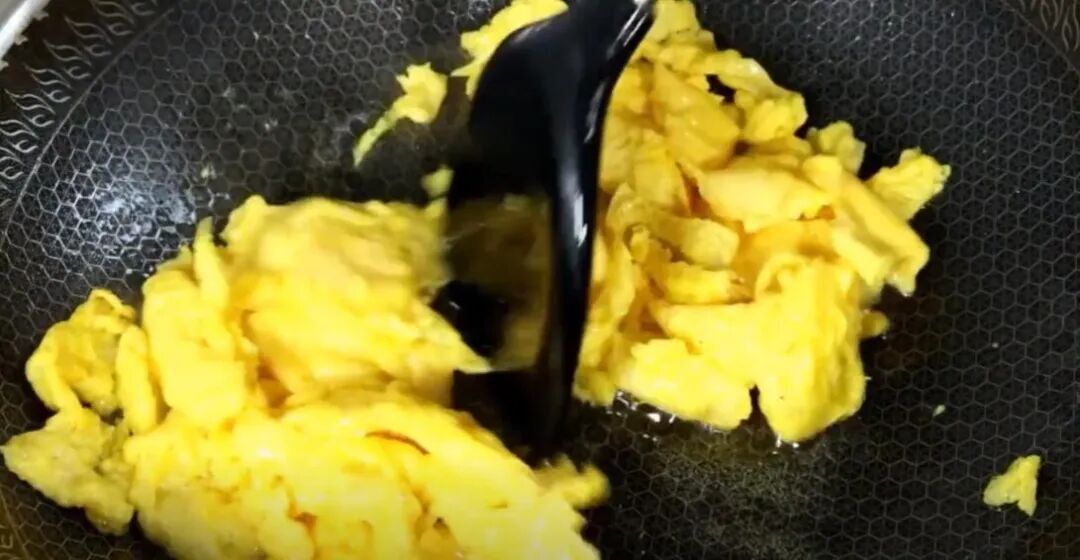 11、之所以先把鸡蛋煎一下,是因为这样吃起来口感更嫩,更有营养,将炒成金黄色的鸡蛋,铲出锅备用。