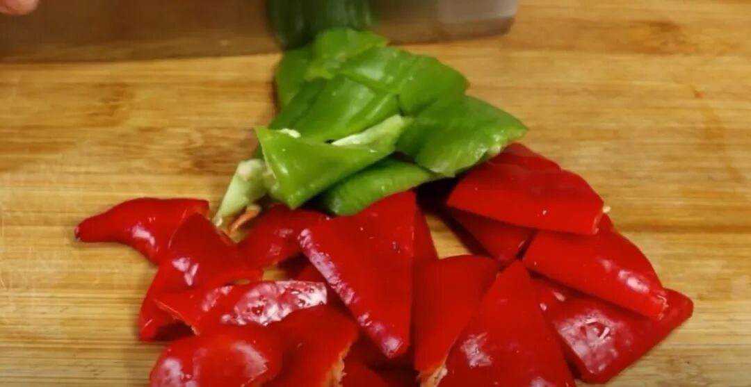 3、准备一个红椒和青椒,统一从中间对半切开,一分为二,再改刀切成均匀的小块,就直接装碗里备用。