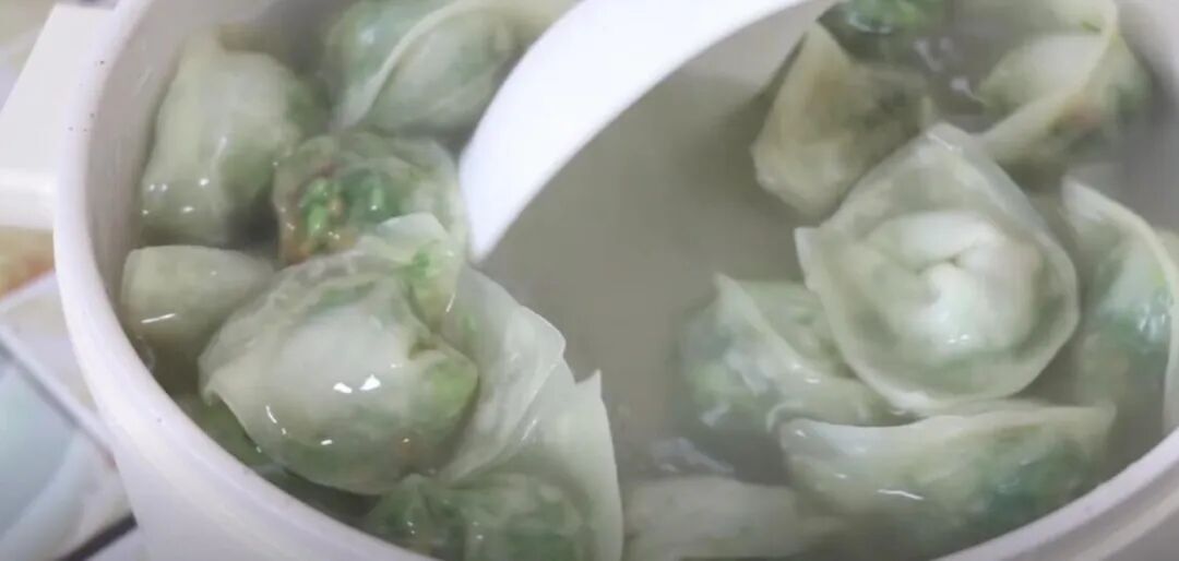 9、提前烧一锅开水,下入刚包好的馄饨,用勺子轻轻的搅一下,防止粘在一起,最后煮的馄饨都飘起来,变成透明的状态,就可以出锅了。