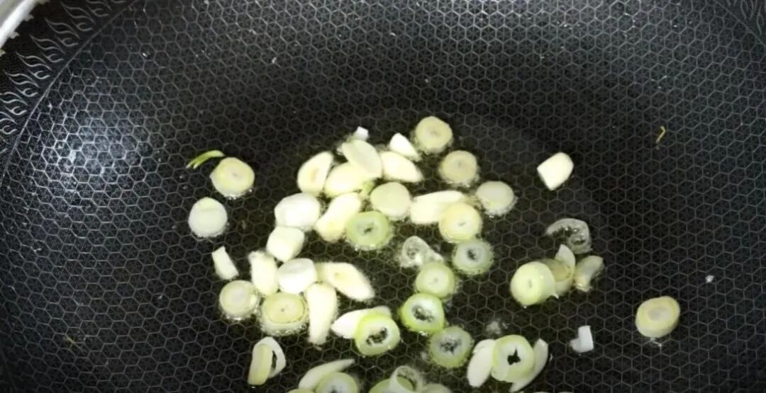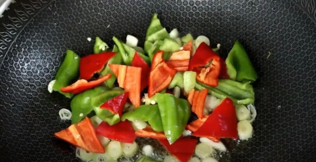 12、锅里加入葱蒜爆香炒均匀,炒出香味,倒入青、红辣椒,翻炒出辣椒的香味。
