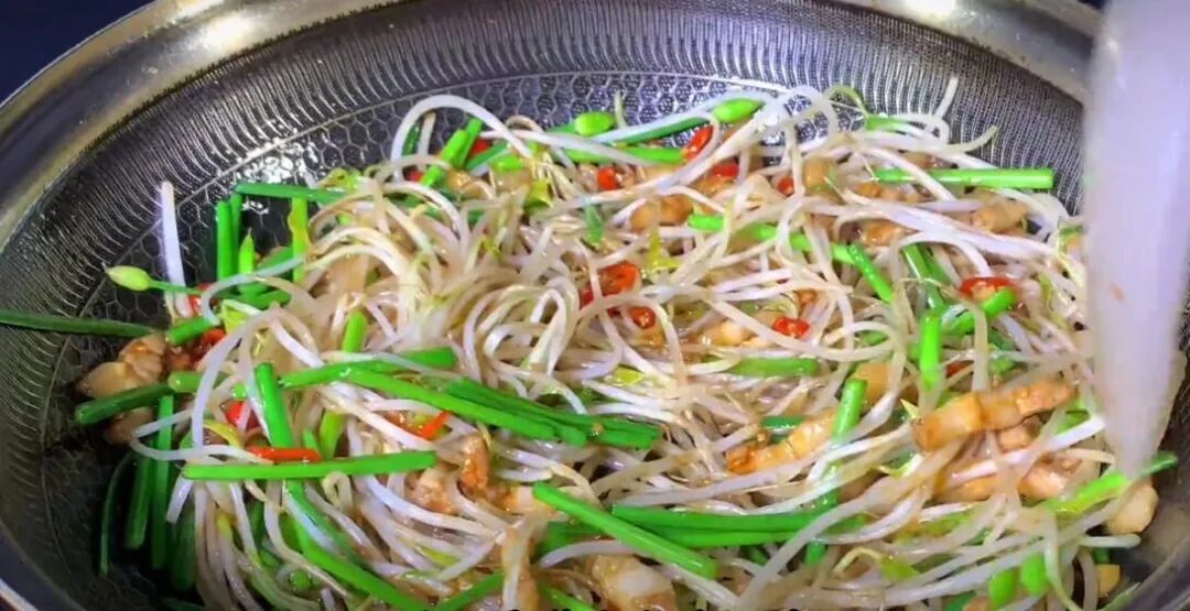 10、这样做出来的豆芽鲜嫩入味,吃起来脆爽可口,而且加了五花肉和辣椒,特别下饭。