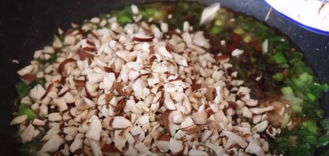 5、在锅里倒点食用油,放入葱末和姜末炒出香味,中间加点生抽,十香粉,老抽,食用盐,最后再加入香菇翻炒均匀。