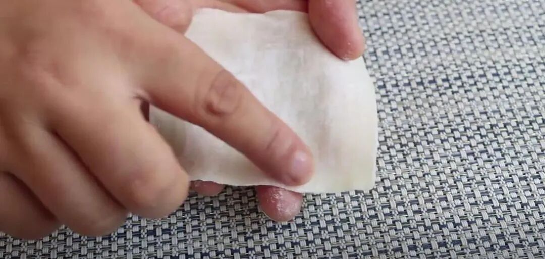 7、准备一碗的清水,用食指沾点水,然后取一张馄饨皮,把四周给它都抹上清水,放上调好的馅料,两面对折,边缘的给它捏紧。