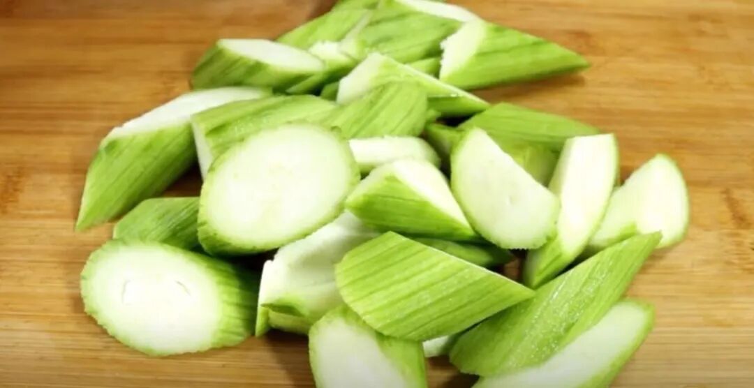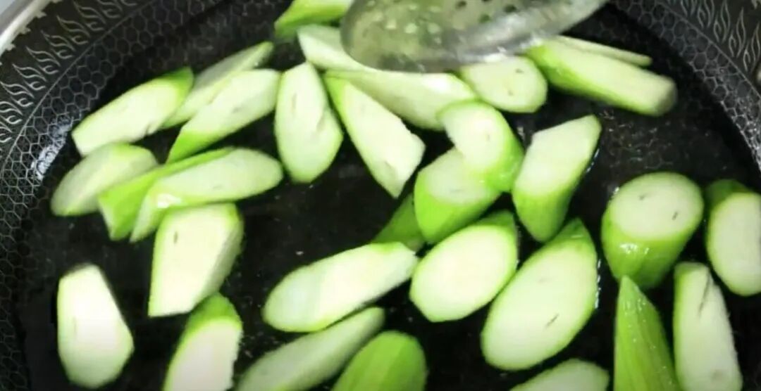 8、丝瓜味道特别的鲜美,调料不用加太多,提前烧半锅开水,倒入丝瓜,加入一勺食用油,加入食用油可以保证丝瓜的颜色翠绿,像翡翠一样好吃又鲜美。
