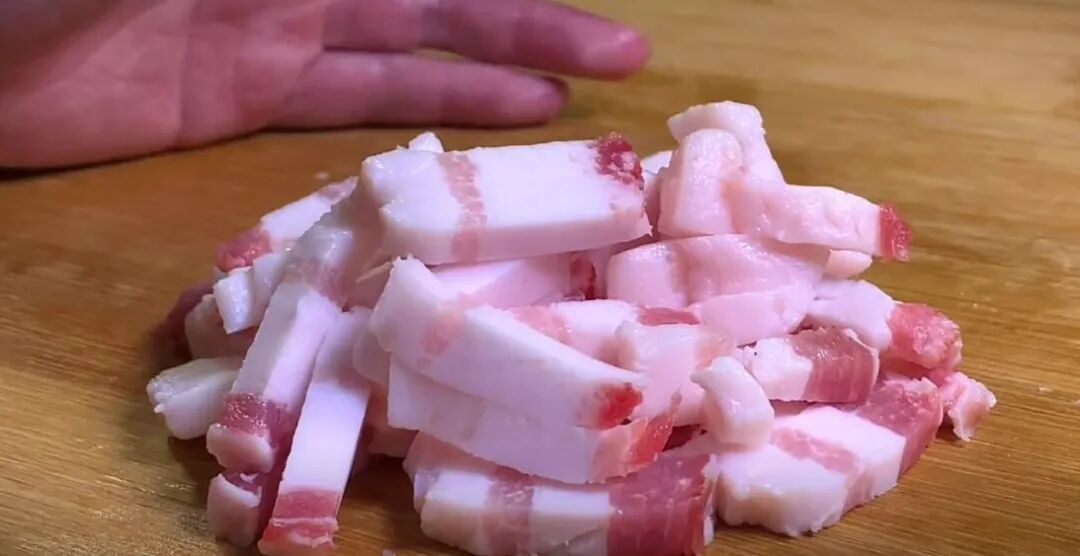 4、炒这个菜最好是选用荤油,准备一块钱的五花肉,去皮后再改刀切成长条,在切肉的时候可以提前冷冻一下,这样切出来的肉会更加均匀。