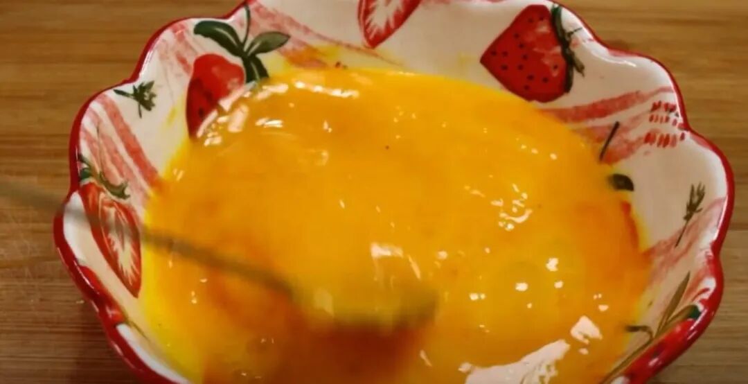 9、大约等30秒,就把丝瓜捞出来,接着在锅里加入适量的菜籽油,倒入鸡蛋液,轻轻推动一下,煎成鸡蛋饼。