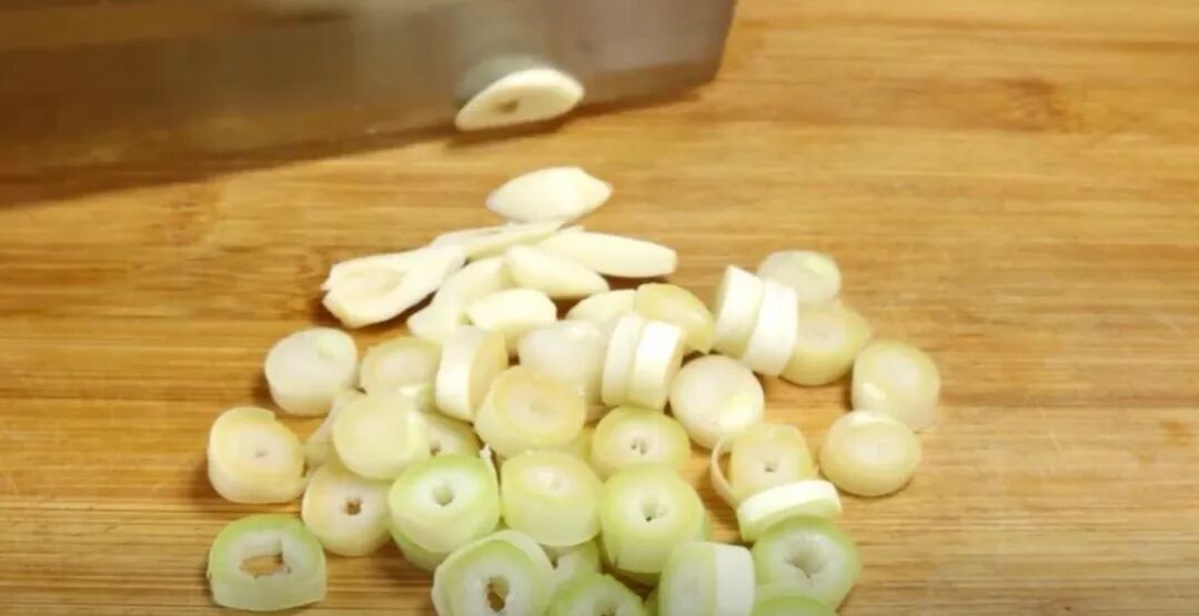 5、准备一颗大葱,把它切成漂亮的葱花,再把三颗大蒜切成蒜片,放入好看的盘子里留着备用。