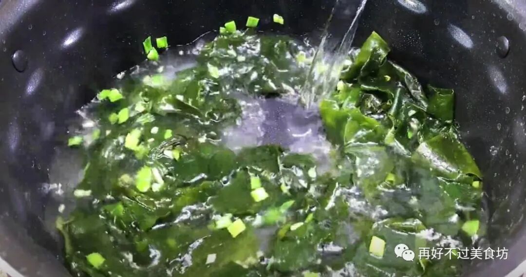 6、锅中烧水,淋点食用油,水开之后,把裙带菜全倒进来,提前把裙带菜烫一下。