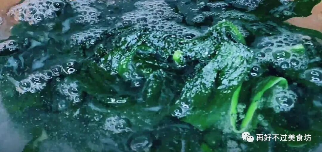 7、烫的时间一定不能太久,防止营养流失,被烫久的裙带菜也会发绵不爽口,烫上2分钟就捞出,倒进冷水里放凉。