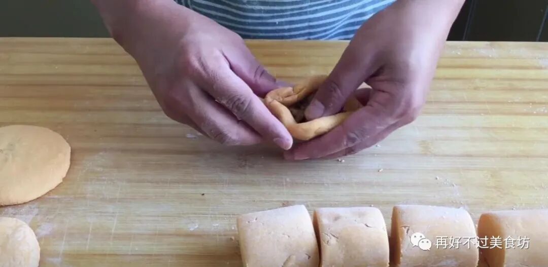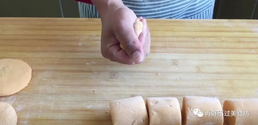 6、搓完后切成均匀大小的八个面剂子,每个大概在80克左右,拿起一个面剂子,先是整成小圆球,然后再压扁,捏成饼皮。
