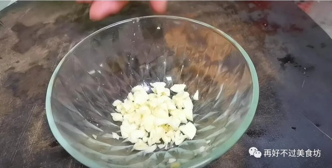 3、准备几瓣大蒜,先用菜刀把大蒜全部拍一下,然后切碎,切成蒜末。