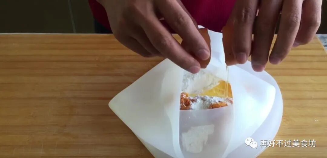 4、用绳子将袋口绑紧,再用双手来回按压,等红薯泥、鸡蛋、糯米粉都揉在一起,就算是可以了。
