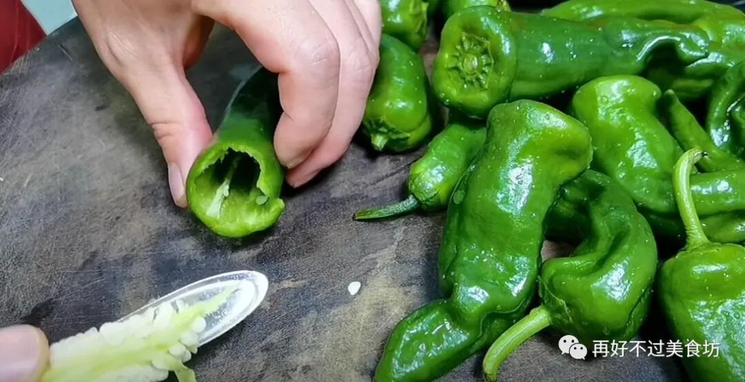 1、把买来的青辣椒洗干净,然后把辣椒蒂给切掉,再用一个勺子柄,把辣椒里的籽给挖出来,这样取辣椒籽是不是非常方便。