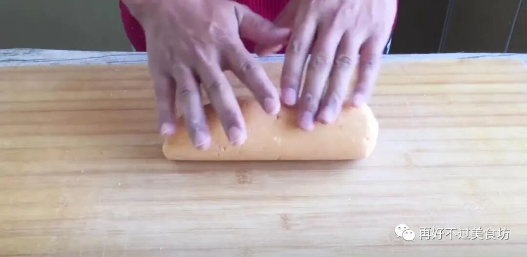 5、将面团取出来放案板上,接着放双手下来回滚动着,直到滚成长条状。