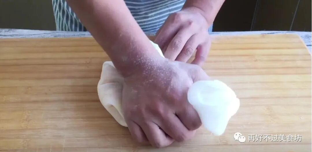 8、包好之后,将其放在案板上,然后掌心朝下,直接将它压扁,要用力均匀,防止把它压漏。
