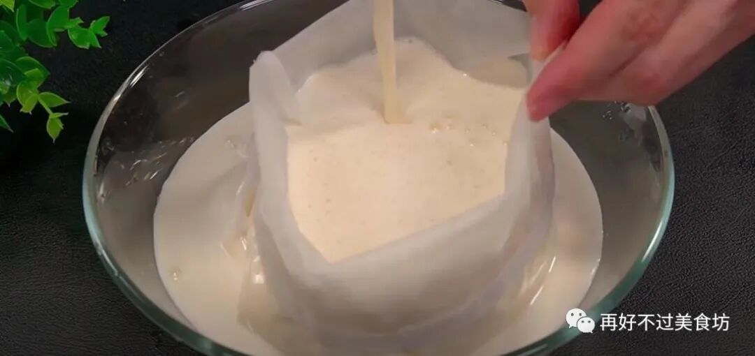 4、把豆浆和豆渣一起倒入纱布里,控出里面多余的豆浆,把这个豆渣过滤出来,最后一定要挤干里面的水分,这样做可以避免浪费。