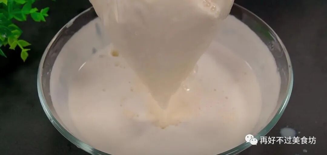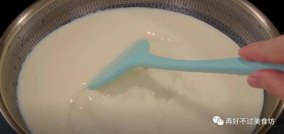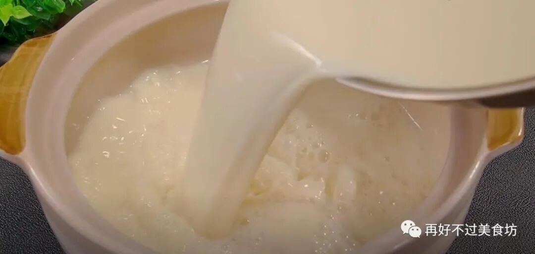 8、这时候豆浆放凉到90度左右,从高处把豆浆冲入砂锅中,让豆浆和豆腐王混合均匀,最后用笊篱撇去上面的浮沫,这样做的豆腐脑比较美观。