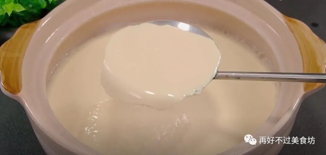 9、盖上盖子焖15分钟,时间到了,打开盖子,用勺子轻轻的敲几下,这个豆腐脑非常有弹性,并且不会碎掉,看起来细腻爽滑,一点不比外面卖的差。