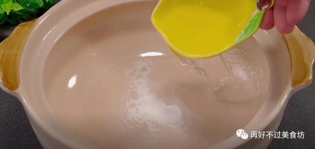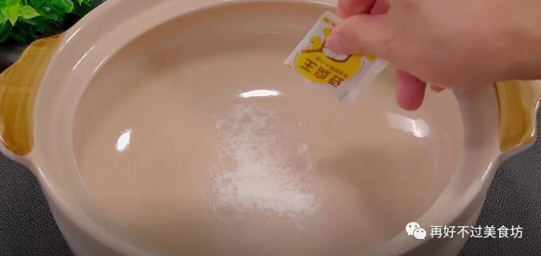 7、下面准备一包豆腐王,一袋三克,可以做两斤豆浆,把豆腐王倒在砂锅中,再加入少许的清水,用右手把它搅拌化开,一直搅拌到没有颗粒状。