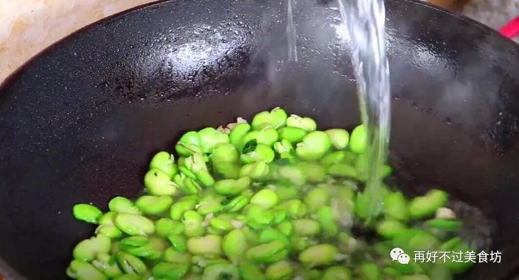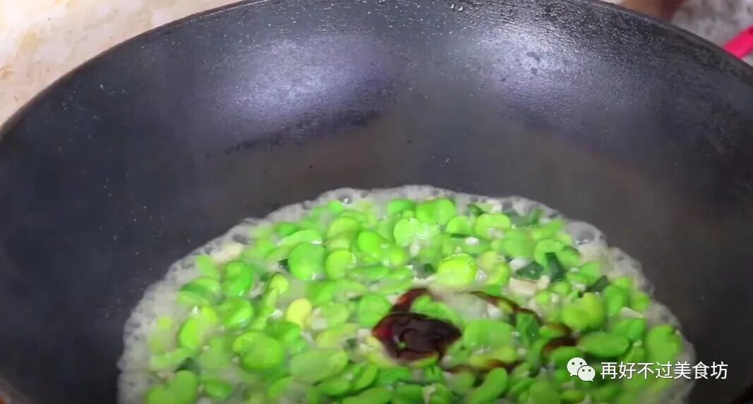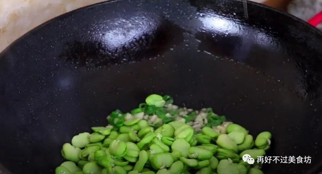4、这时候再加入蒜末和葱花,把它炒香,炒香后放入蚕豆,给它大火翻炒一分钟。