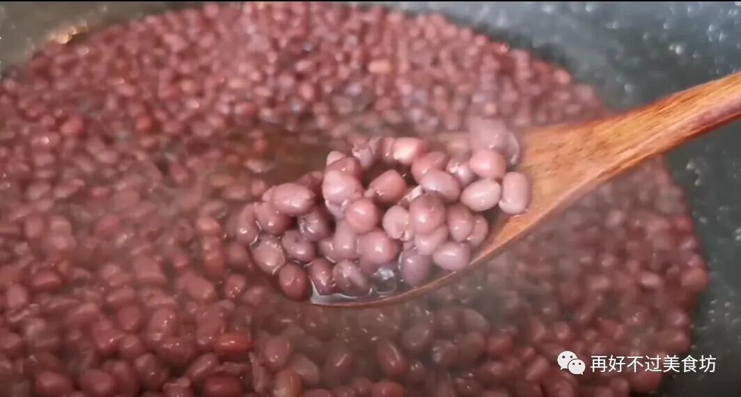 2、水烧开后转中小火煮25分钟,煮至红豆有一点开花,用手一捏就碎就可以了,再用过滤网把红豆捞出来,装入盘中。