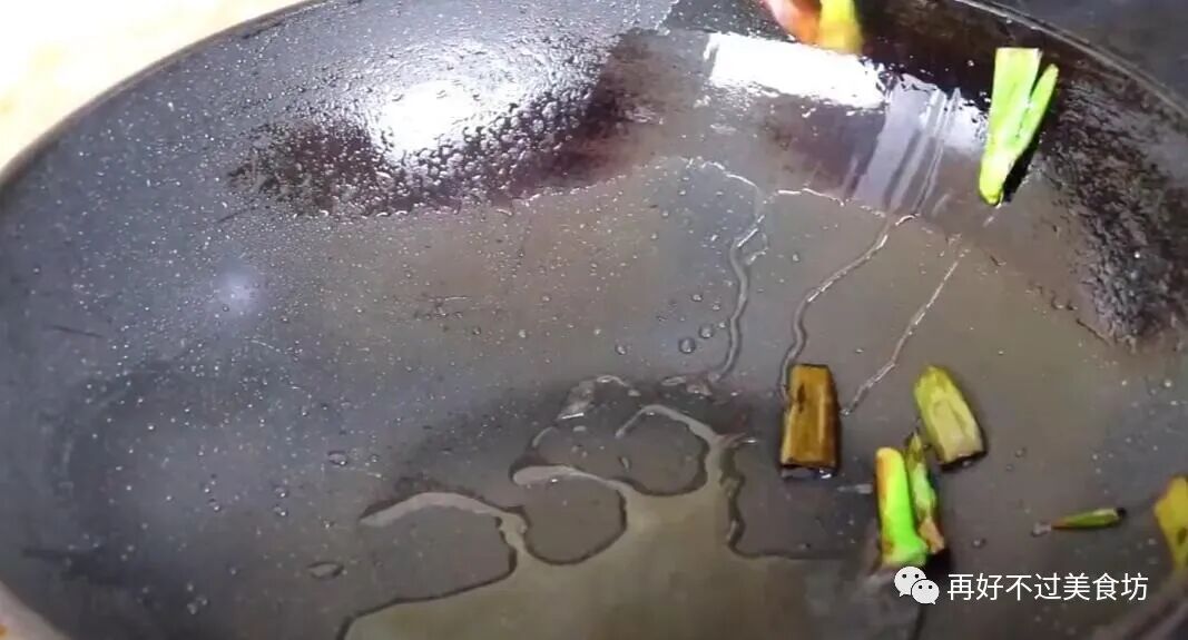3、起锅倒油,放入葱段给它爆香,葱段炸焦后,取出不要。