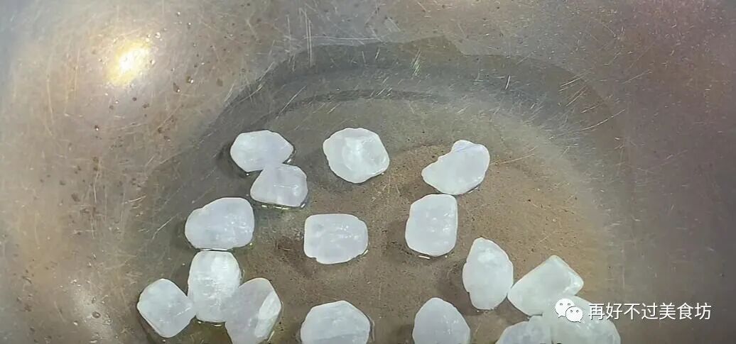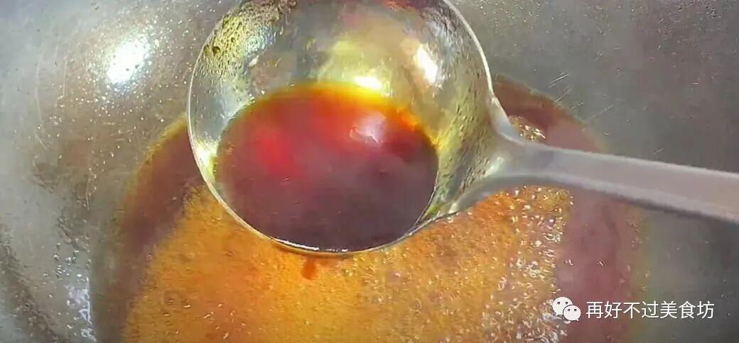8、起锅烧油,油热后,倒入适量的冰糖,接下来炒个糖色,开小火,炒至起小泡呈枣红色时,稍微加入少许热水,继续给它熬制一分钟,就盛出备用。