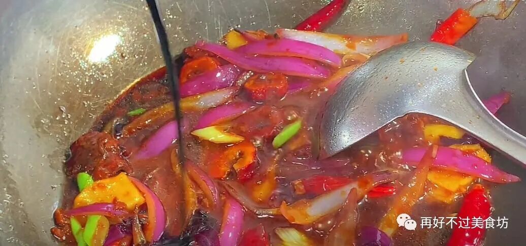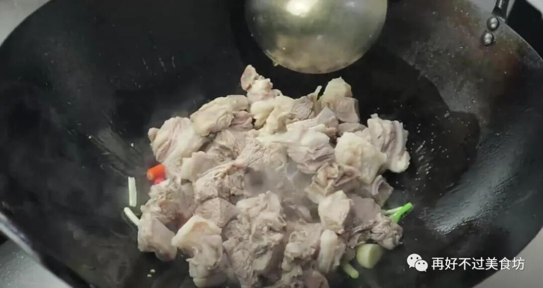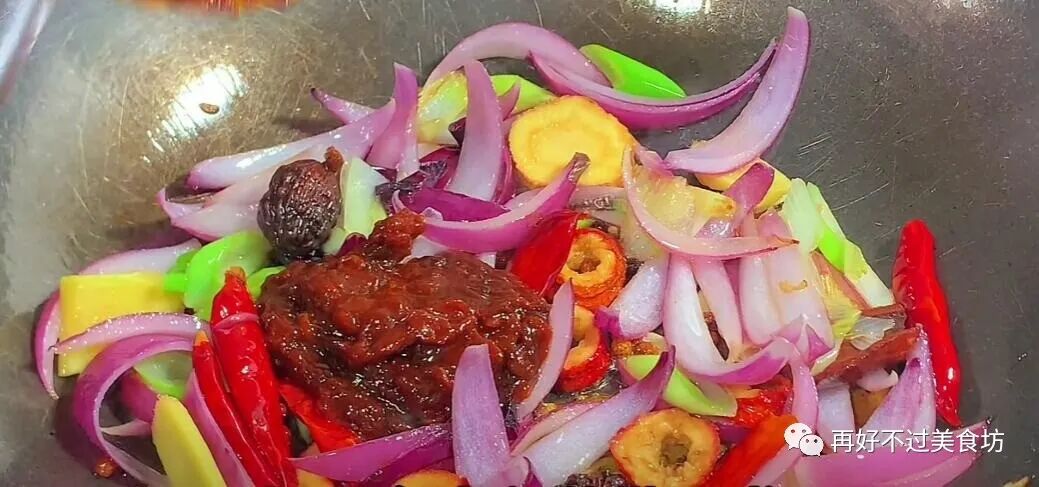 9、再次起锅烧油,油热后下入葱,姜,洋葱块,快速翻炒均匀,再倒入泡好的大料,快速翻炒,炒出香味。