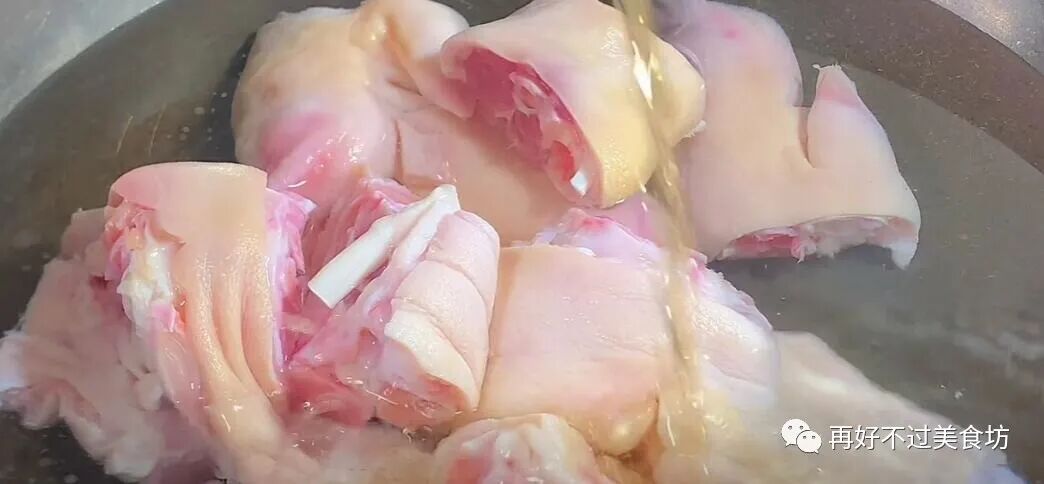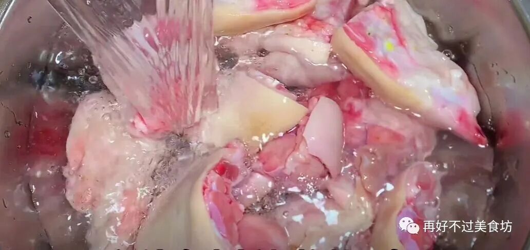 4、用漏勺把焯烫好的猪蹄控水捞出,再给它放入温开水盆中,洗去表面的浮沫。