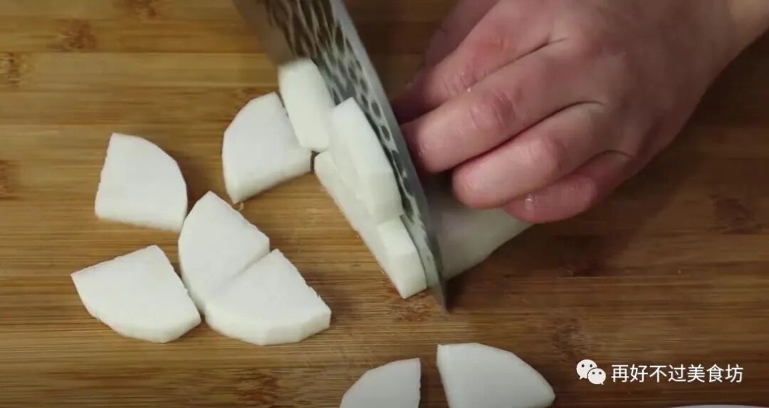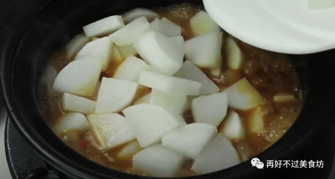 9、时间一到,放入白萝卜,烧羊肉最好放点白萝卜,这样不仅健康好吃,而且还能有效的去除羊膻味。