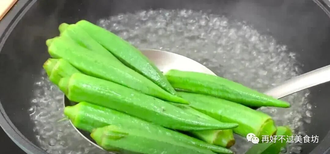 2、锅中提前烧开水,水开以后,加入食盐和食用油,然后倒入秋葵焯水1分钟,之后控干水分,放入凉水中过凉。