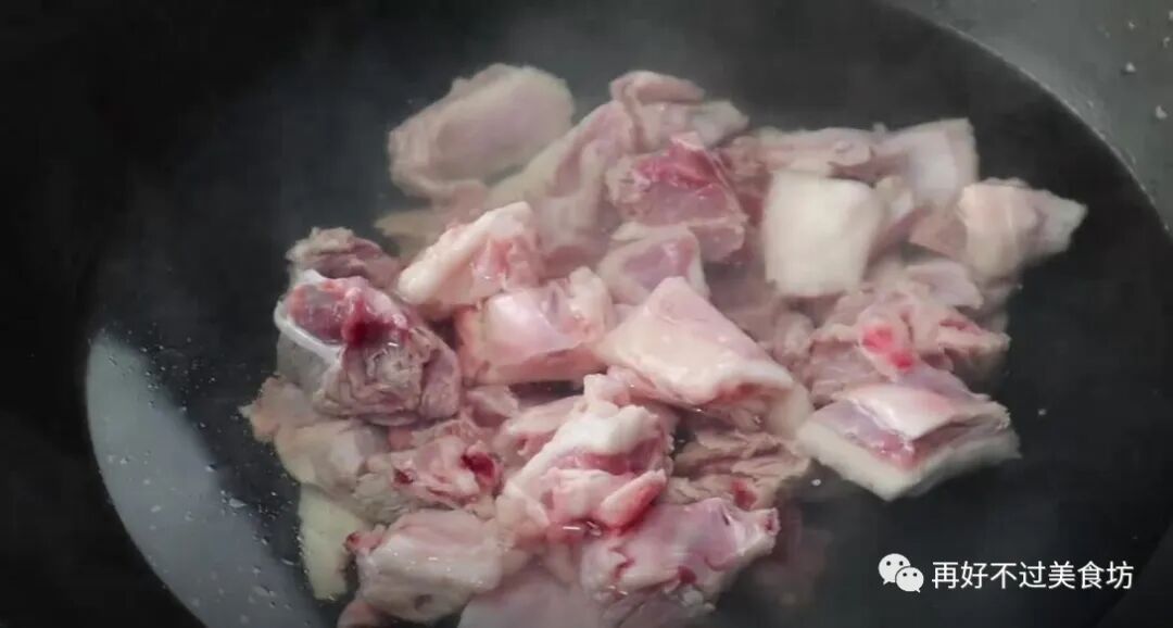 4、锅中烧水,冷水下入羊肉焯水,去除血水和异味,加适量黄酒去腥。