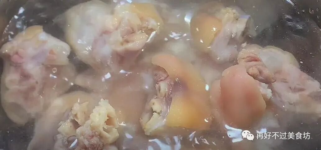 1、把剁好的猪蹄倒入铁盆中,再倒入适量的清水,把它给清洗干净,一定要多清洗几遍,洗好以后控水捞出备用。