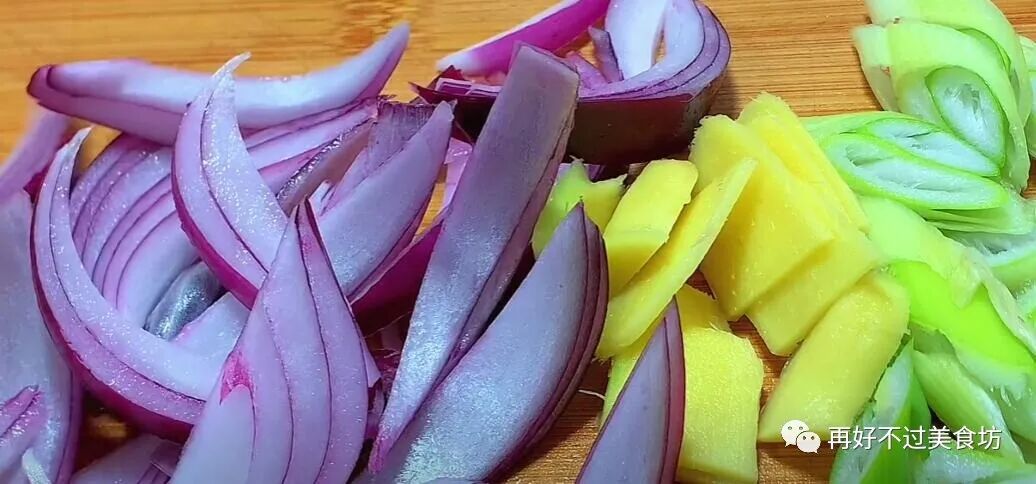 7、另外准备大葱,斜切成小段,生姜改刀切片,半个洋葱切成小块,抖散后,先放一边备用。