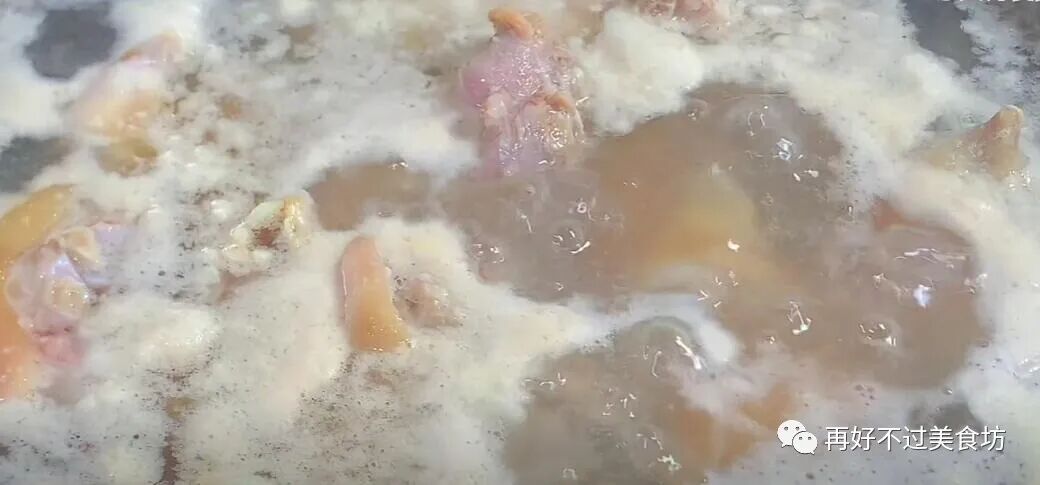 3、用勺子把上面的浮沫全部撇掉,这个时候不要盖锅盖,开大火煮上五分钟左右。