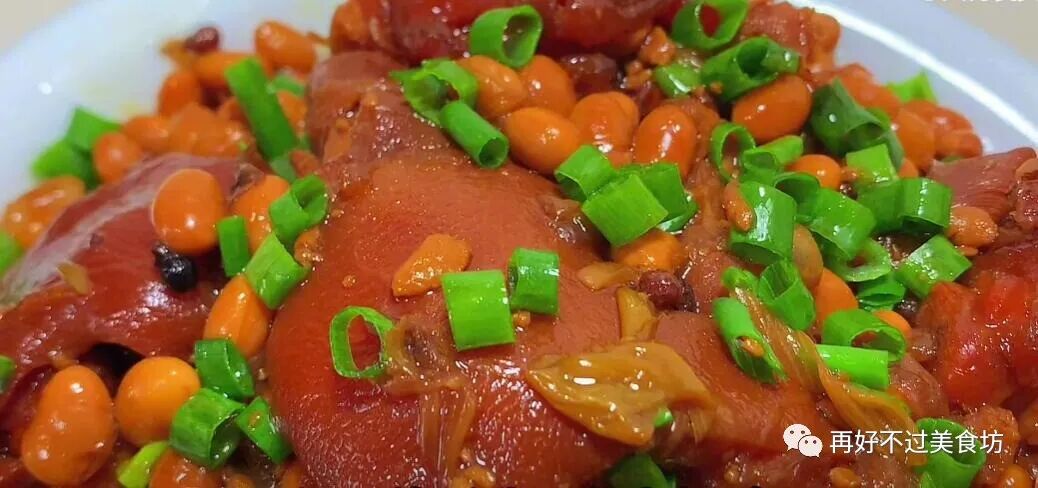 15、最后再浇上卤汁,撒上葱花,简单美味的猪蹄炖黄豆,就制作完成了,可以说是色香味俱全,轻松脱骨,满满的胶原蛋白。