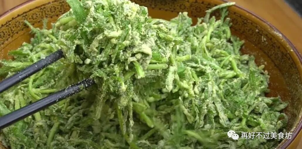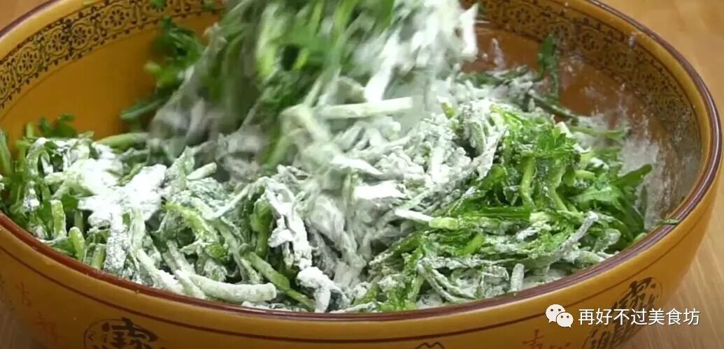 4、接着分次加入适量的面粉,每加一次,都要充分地搅拌,确保每根茼蒿都能裹上面粉,最后加入两勺玉米面,再次翻拌均匀就可以了。