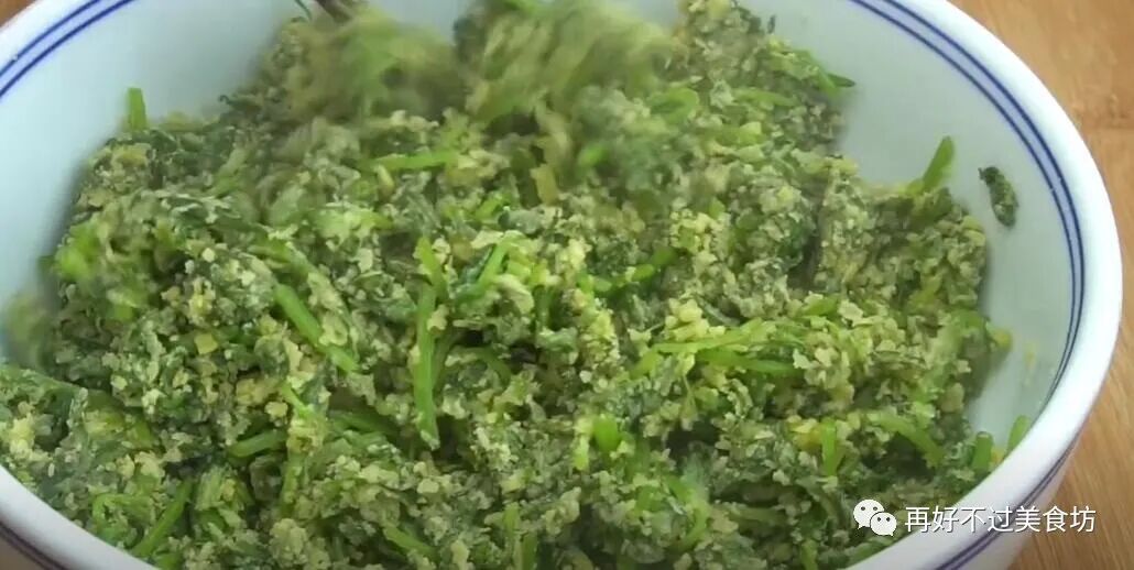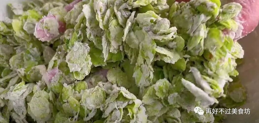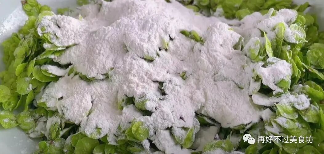4、然后分次少量加入面粉,一边加一边用手不停地抓拌,吃榆钱的好处非常多,一是它有“余钱”的谐音,预示着今年吃榆钱就有余钱。