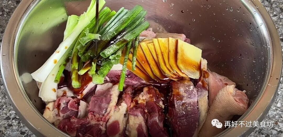 2、接着在上面放点姜片、小葱,再加点胡椒粉,米酒,生抽,将鹅肉拌匀腌十分钟。