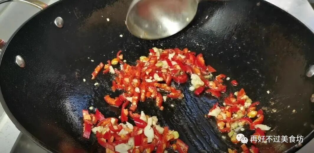 7、接着在锅中倒入小料炒香,等小料被煸炒出香味,就往里加入一些生抽和蚝油,将它们翻炒均匀。