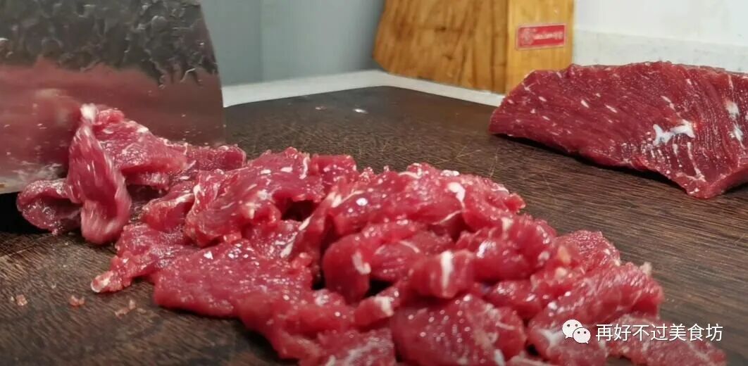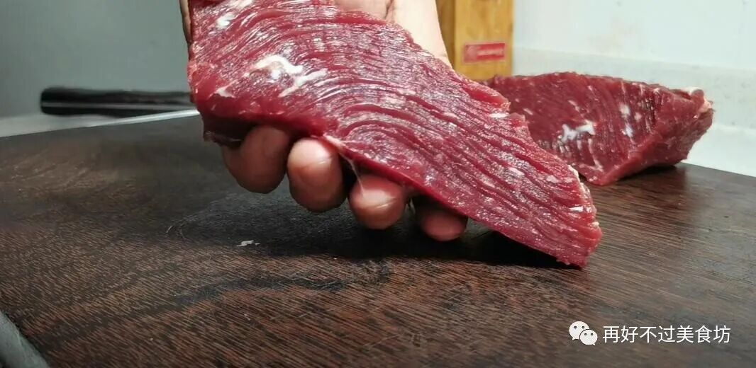 1、将牛肉切开,然后看一下它的纹理,逆着它的纹理切成薄片,尽量切的薄一些,炒的时候会更容易成熟。