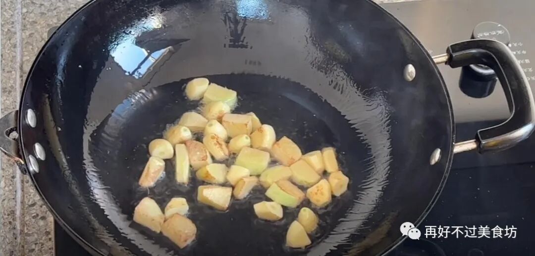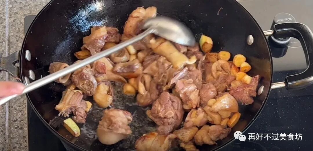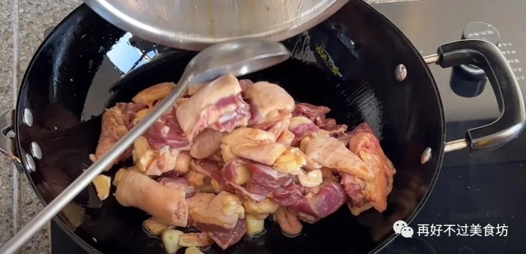 4、姜蒜爆香后,再倒入鹅肉煸炒,新鲜的鹅肉不用焯水,直接生炒味道更香,小火炒三到四分钟,炒出鹅油。