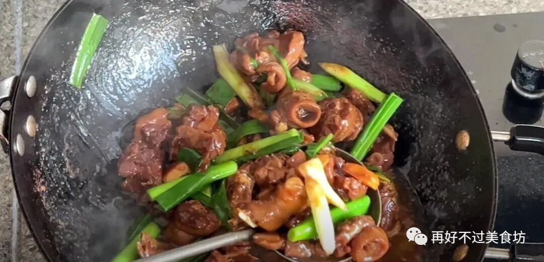 7、40分钟后打开锅盖,转大火把酱汁收浓,等酱汁收浓后,先倒入一些蒜苗梗炒匀,然后再加入蒜苗叶一起炒香。