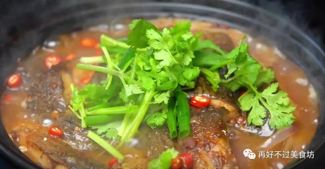 11、时间一到,喜欢吃辣的,撒一些小米椒,再把小葱和香菜放进来,这样一道非常好吃的砂锅炖草鱼就做好了。