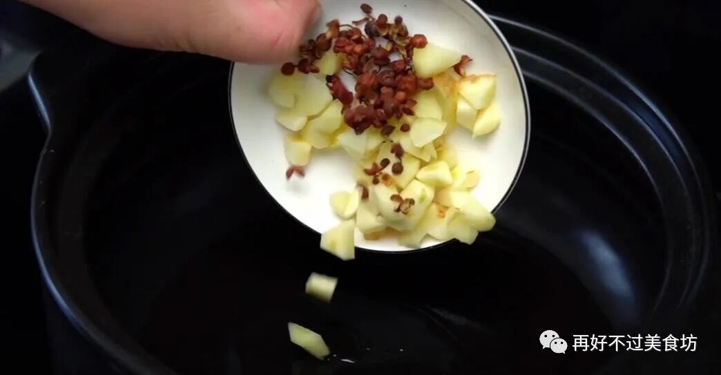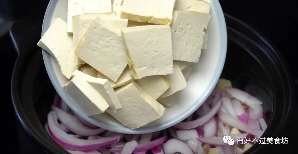 8、油热后,放入生姜、大蒜、花椒,翻炒出香味,接着倒入洋葱,翻炒出香味,把豆腐片摆到锅里,这样可以让豆腐更好的吸收汤汁。