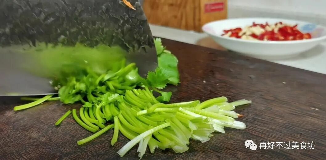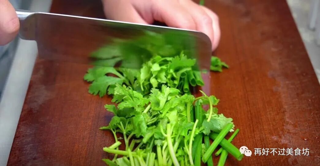 5、再准备一小把洗净的香菜,将它切成小段,再放盘子中备用。