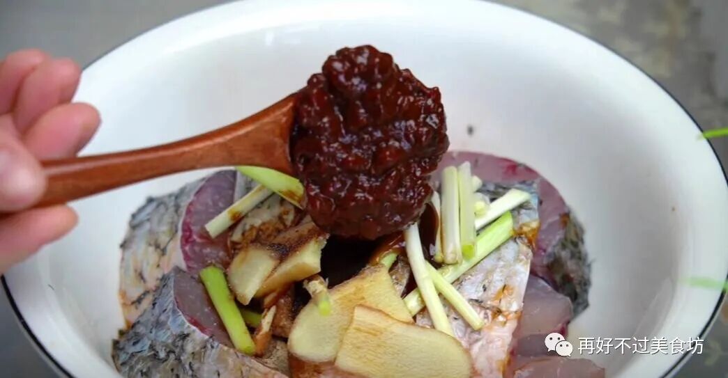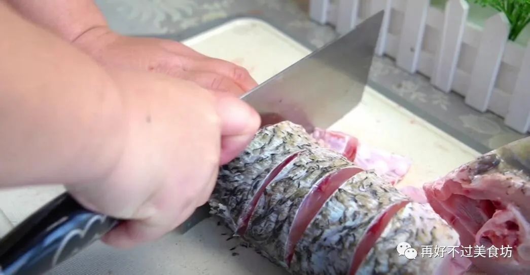 4、接着把鱼头切下来,鱼肉切成两指宽的小块,再从中间切一刀,这样做出来的鱼肉更容易入味,放入大盆中,鱼头和鱼尾可以炖豆腐汤喝。