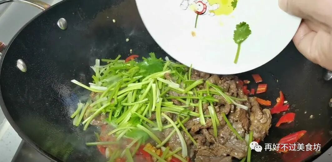 8、重新将牛肉回锅,香菜杆也一起倒进去,接下来就大火快速地将它们翻炒均匀,炒出锅气,炒出香味,炒匀后,即可出锅装盘。